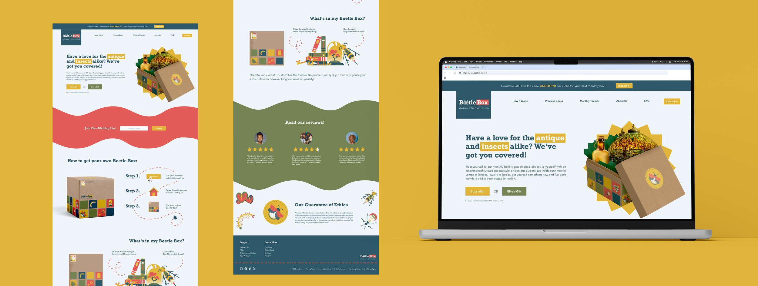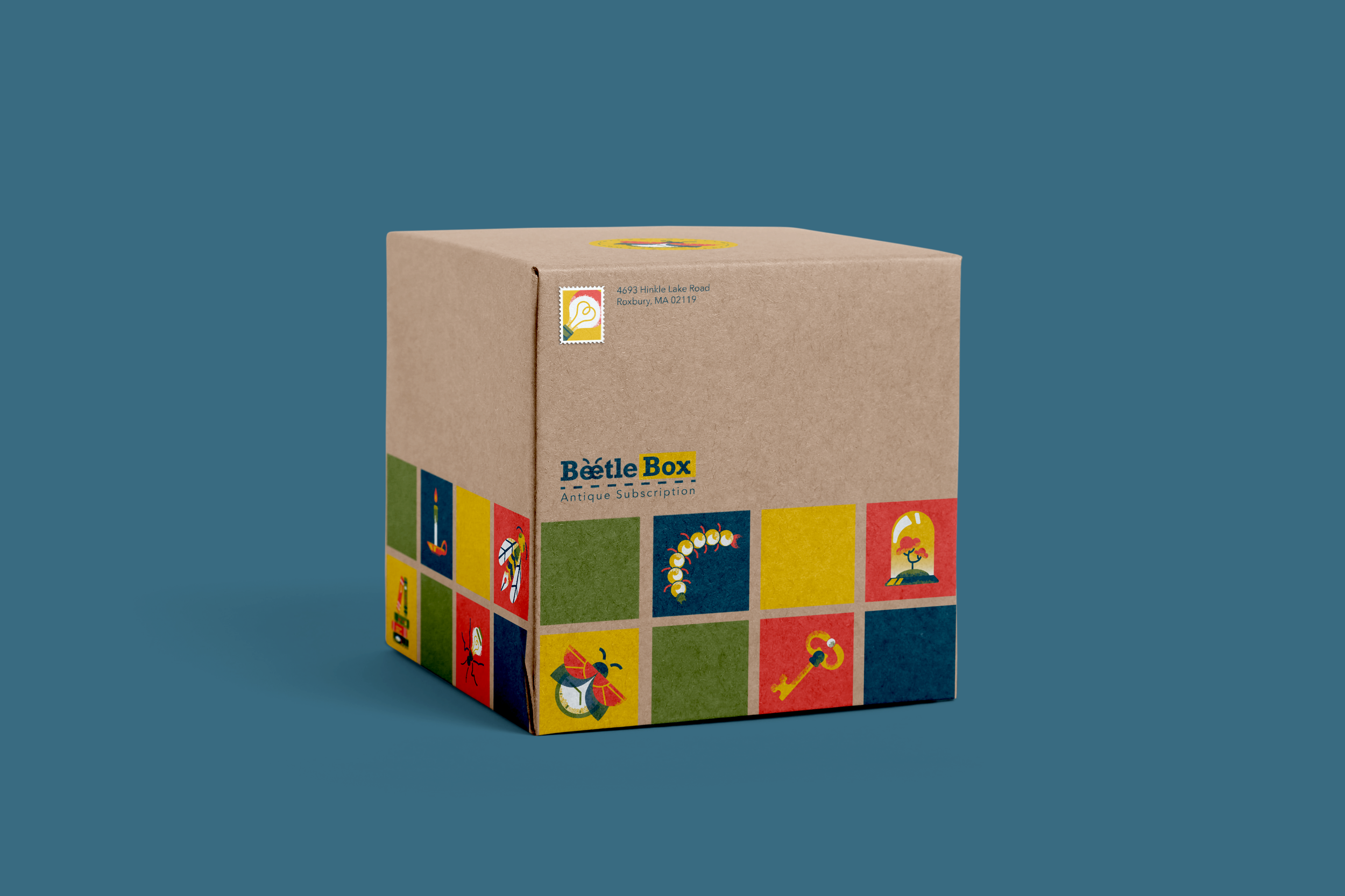 Through merging the ideas of a beetle and a clock, I created a set of icons, using antique objects mixed with insects and several supporting icons. I created my own texture in Illustrator to bring more visual interest. Using the icon set, I created a brand for a monthly subscription box, sending unique bug-themed antiques to your door once a month.